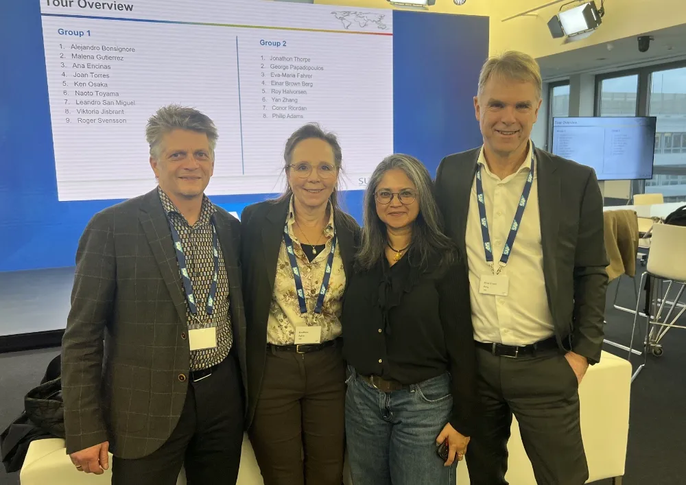 The SBN team to be picked up by the bus for the  experience centre tour. Roy Halvorsen Orkla, Eva-Maria Fahrer SBN, Brindha Safai our SAP Liasion and Einar Brown Berg Nortura.