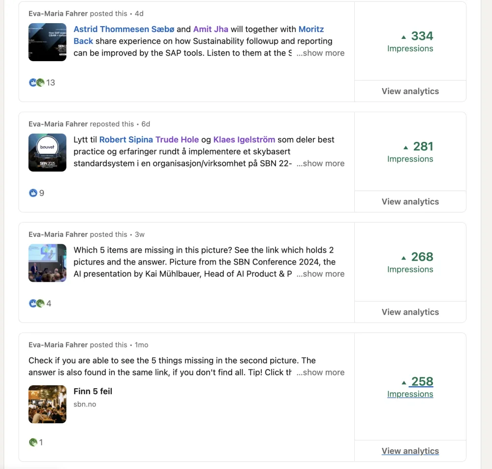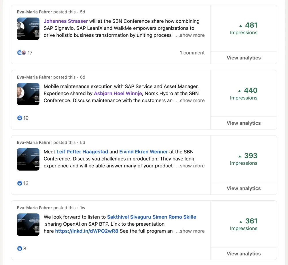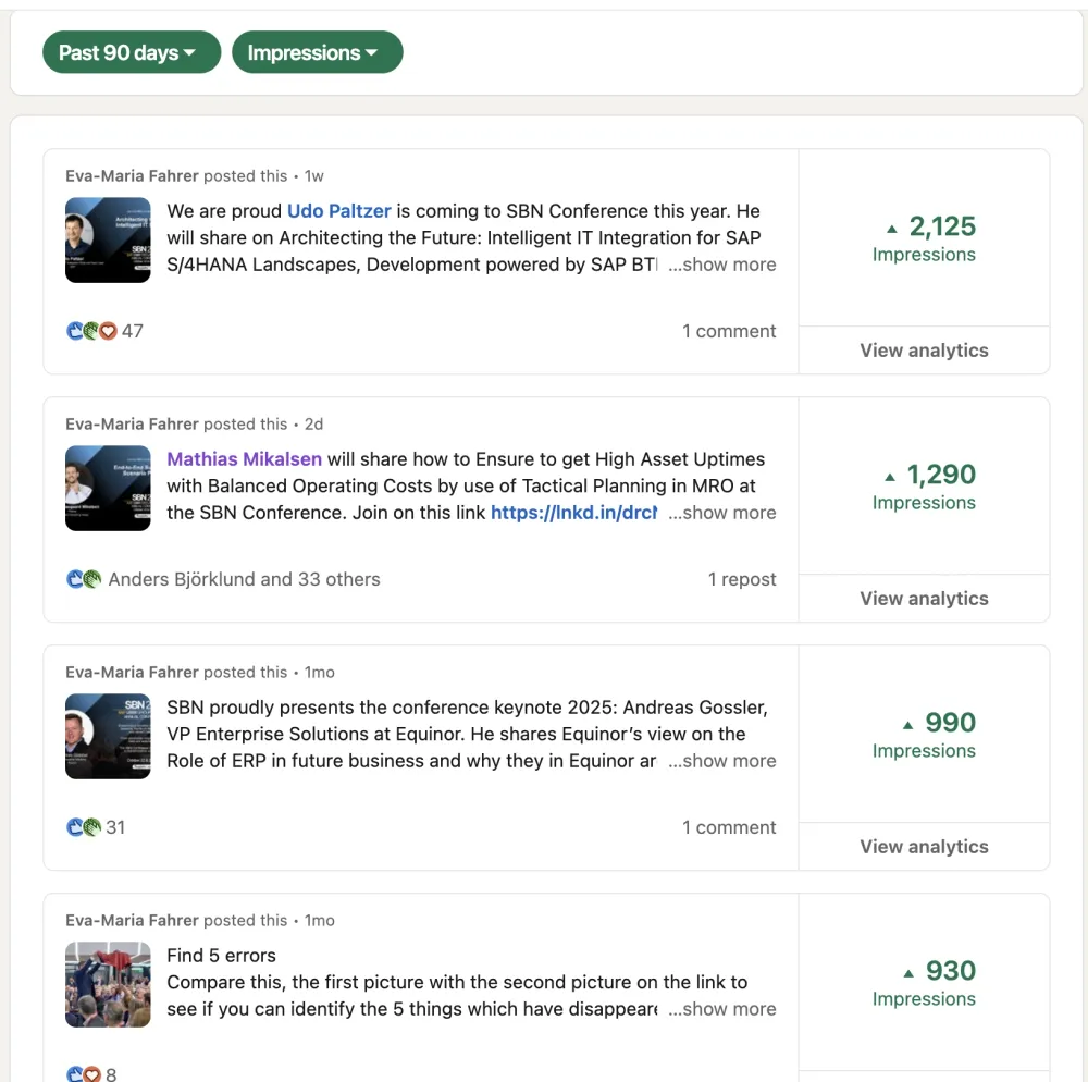 When you compare, important is how many days the post has been on LinkedIn. If one week, one month or yesterday influences the number of "Likes". The selected period is 90 days. Therefore all posts made about conference presentations until today should be in the list.
